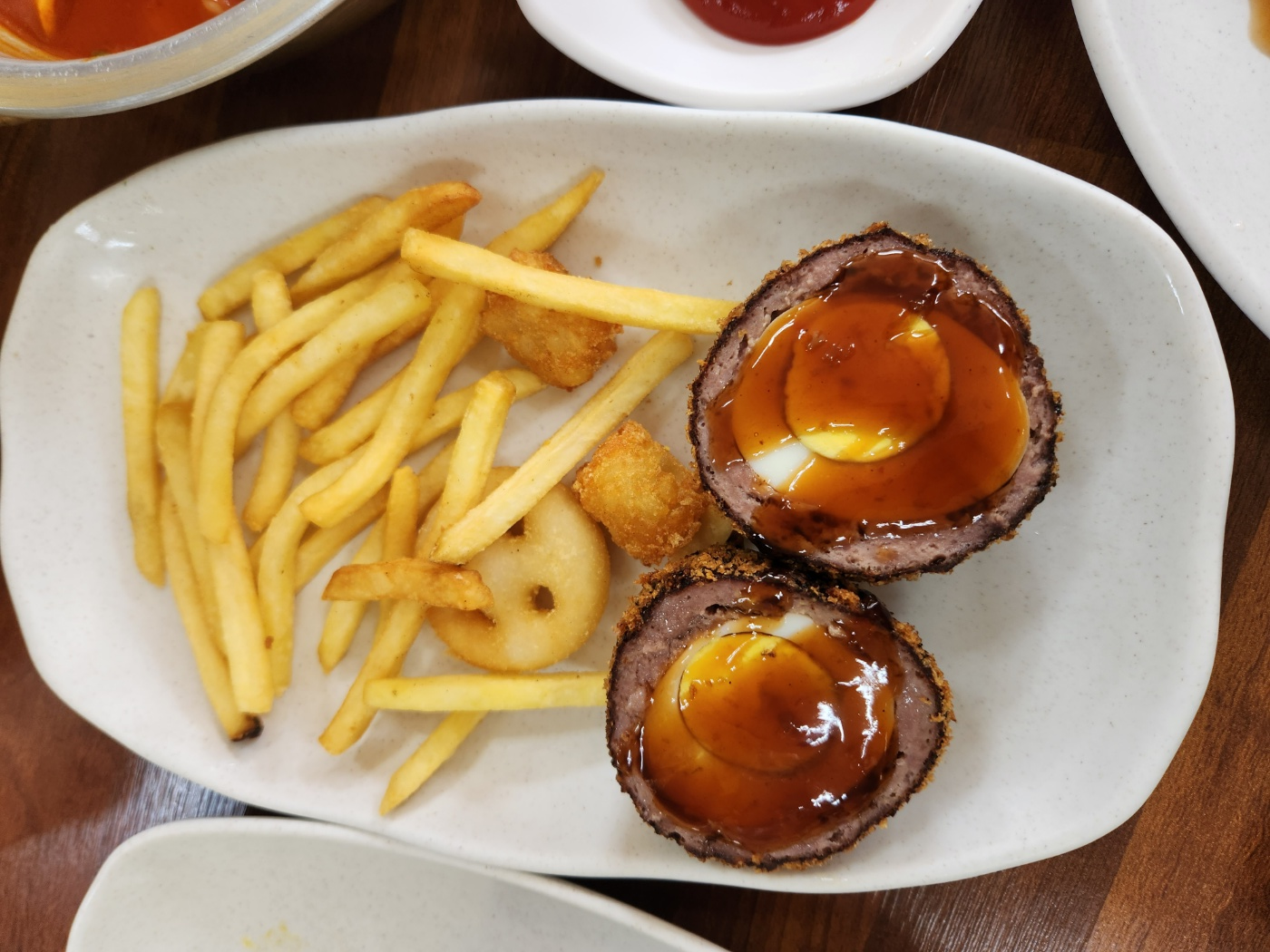 삶은 계란을 떡갈비로 감싸서 튀긴건데