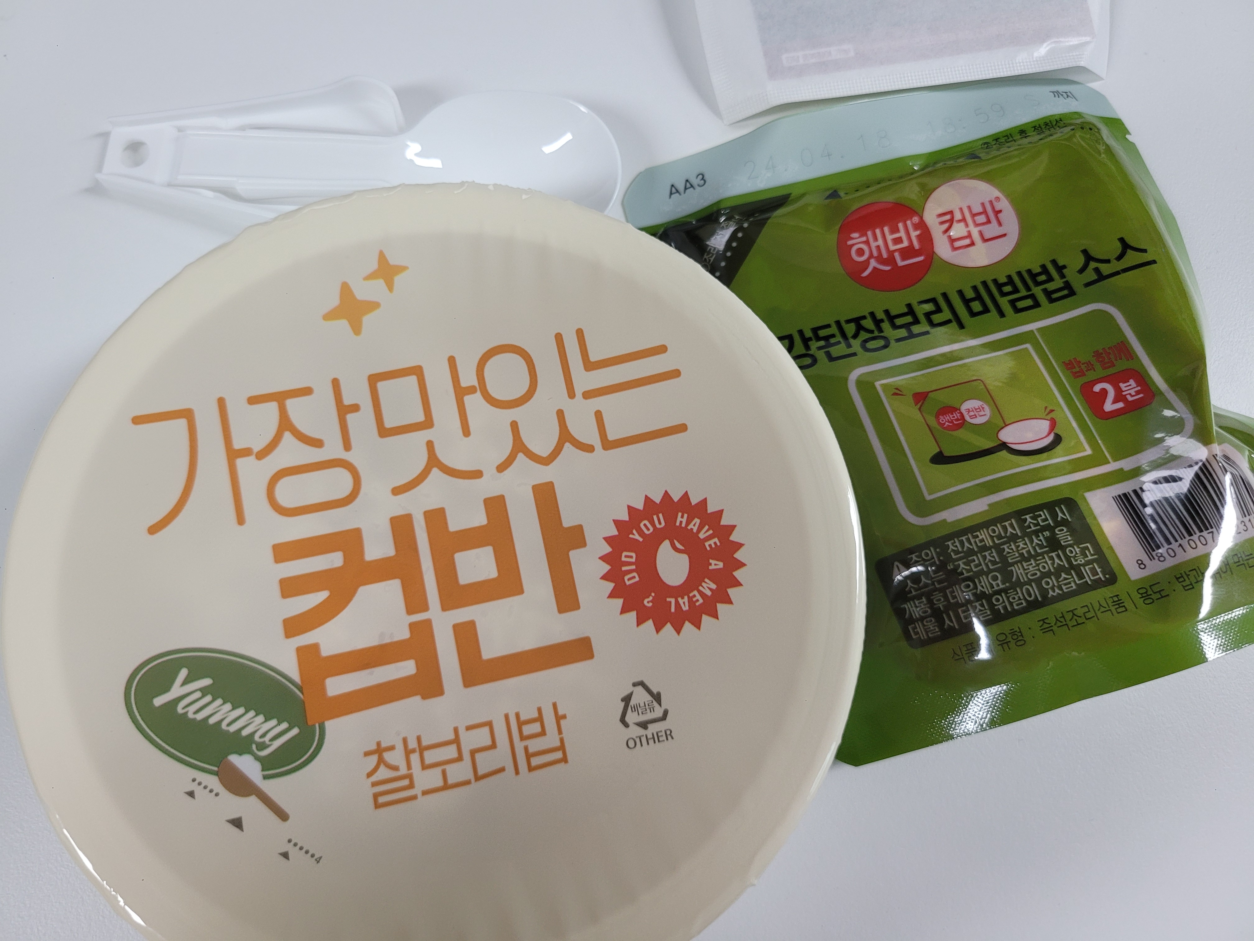 구성품은 햇과 강된장보리비빔밥 소스, 수저 이렇게 세가지가 들어있는데